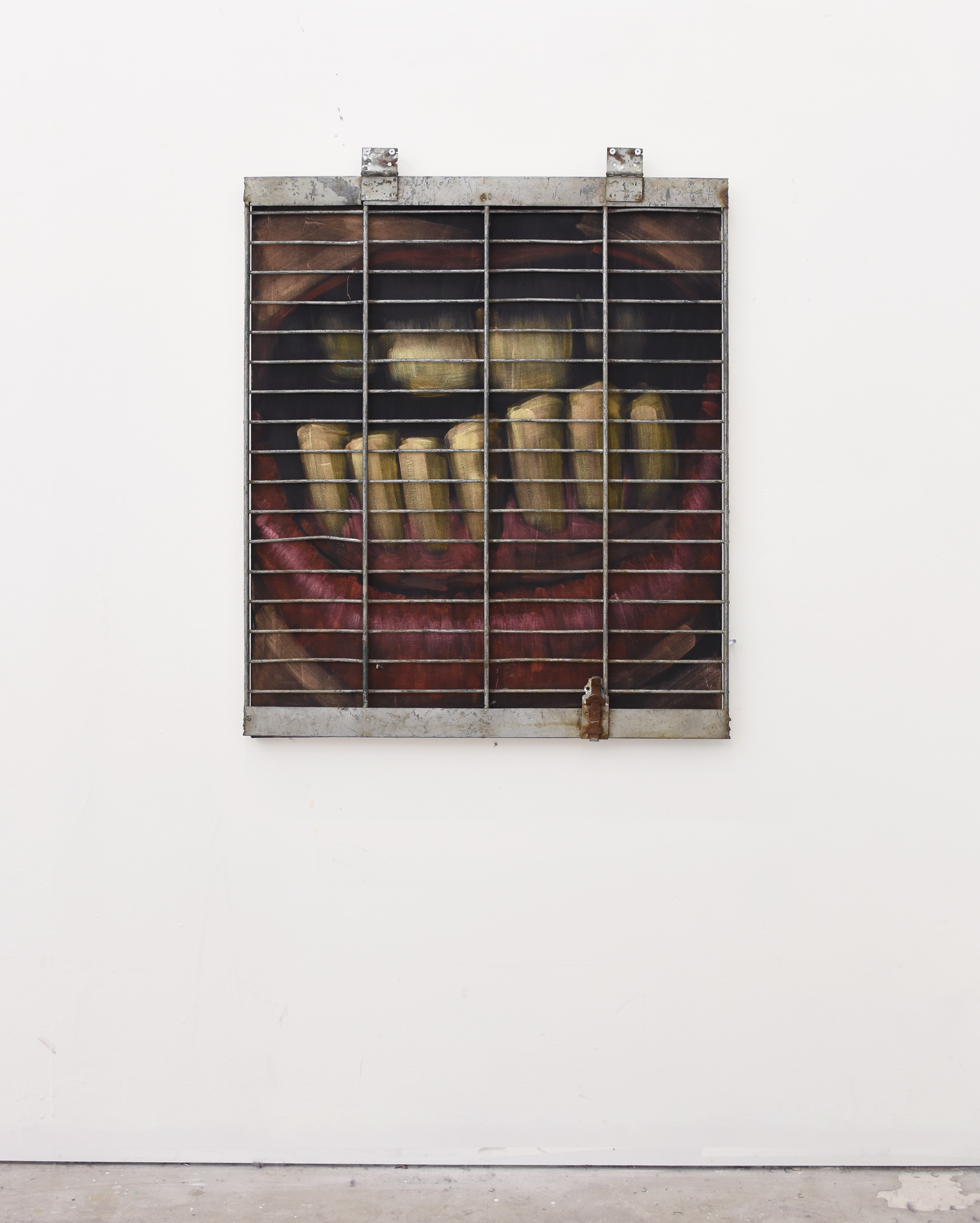 Instalation views: Marcus Nelson, Muzzle (Composite III),2025,steel, oil on canvas, 90 x 80 cm.