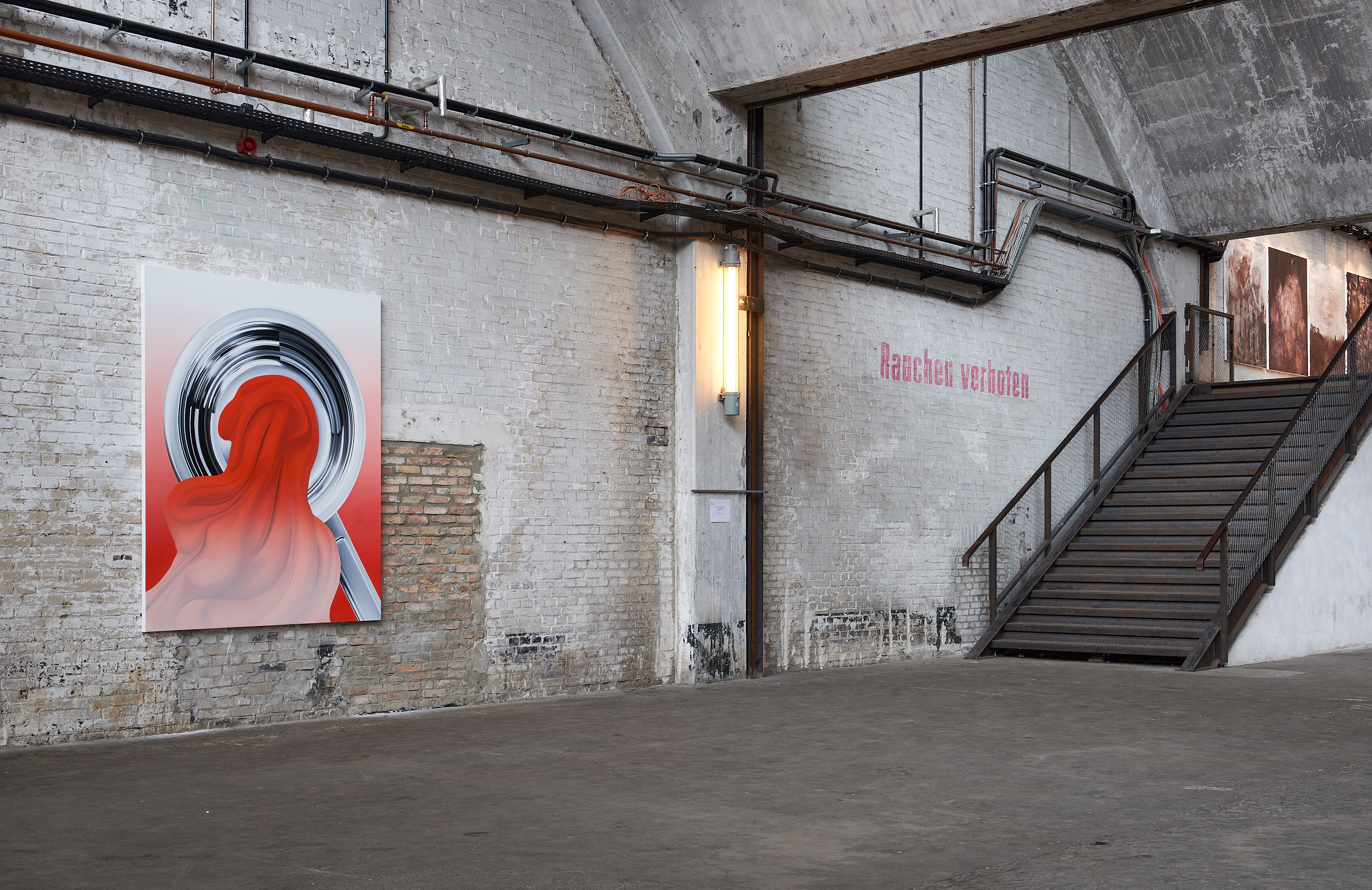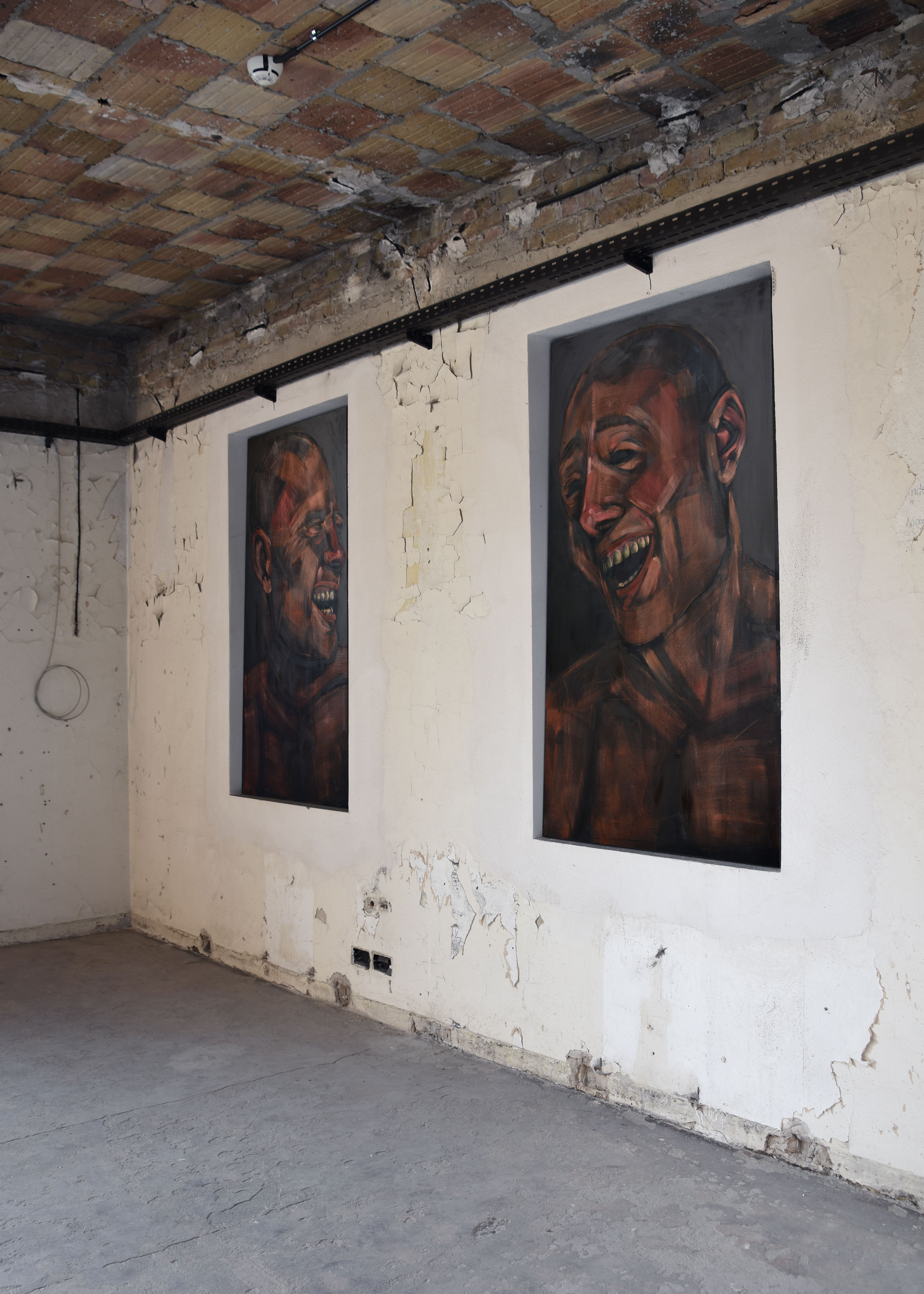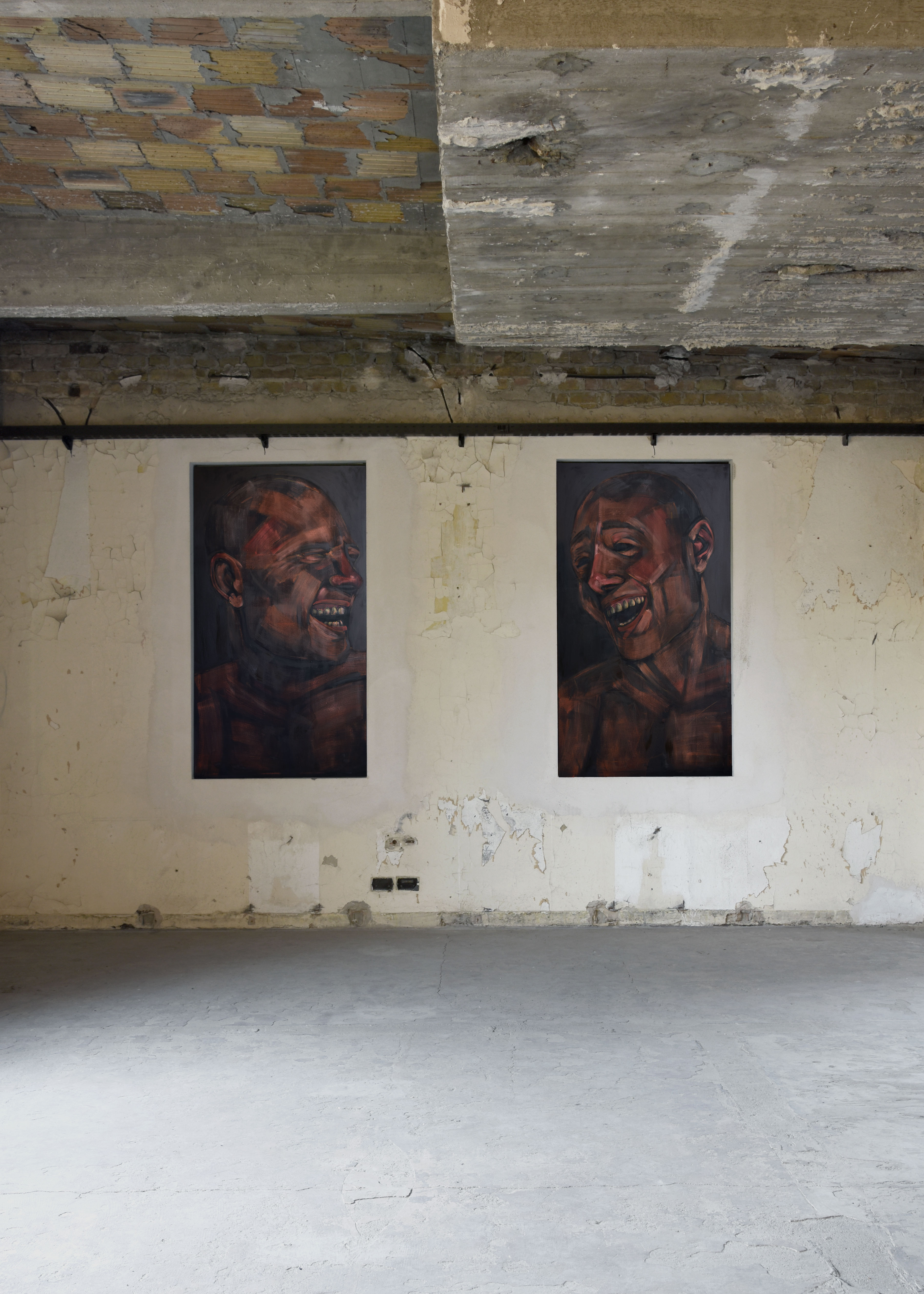 Physically integrated within the walls of the Funkhaus, Berlin, Maskenfreiheit is a site-specific installation exploring the emotional disguises we wear in our daily lives to conform to societal expectations. Laughter is often a persona we present to the exterior world in order to fit in, masking our true feelings. Specifically made to fit within the buildings stark interior, the figures rendered in the diptych become part of the structure that contains them, exploring how urban structures and societal conformities frame and fragment our true self: our real emotions.