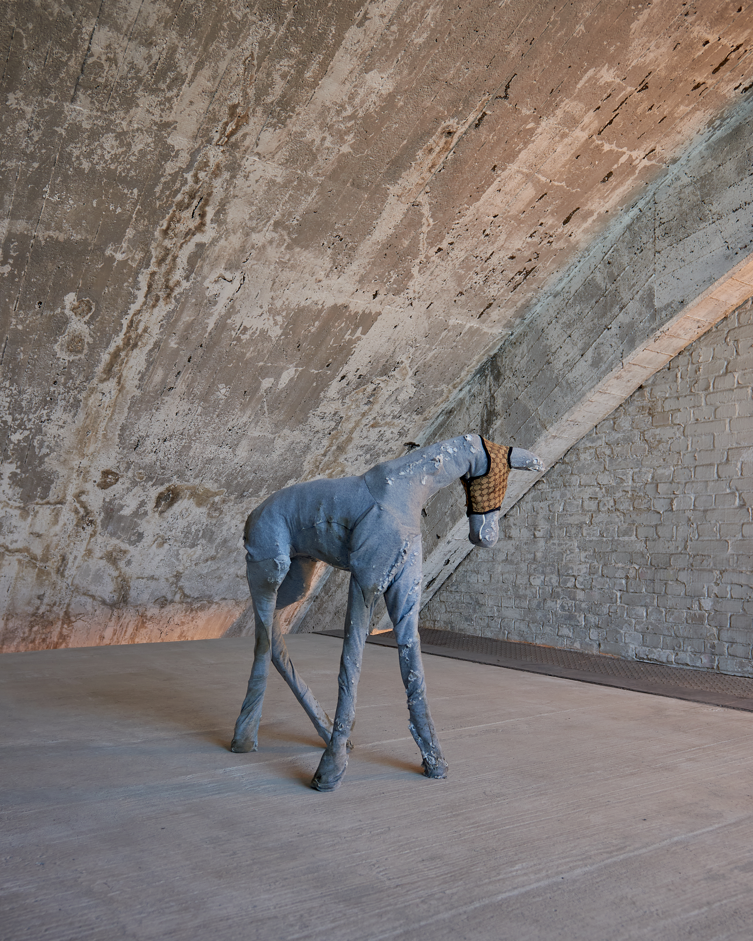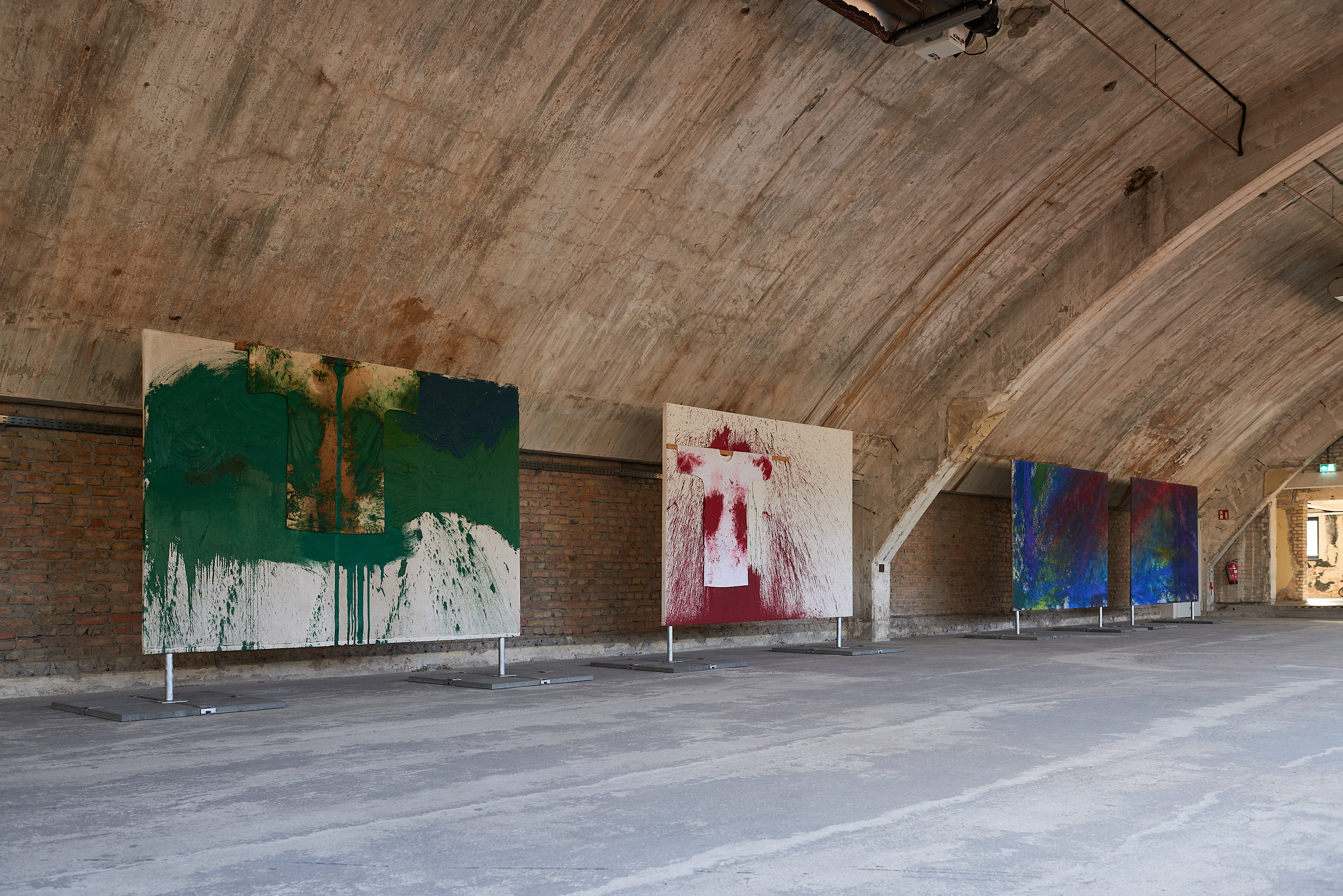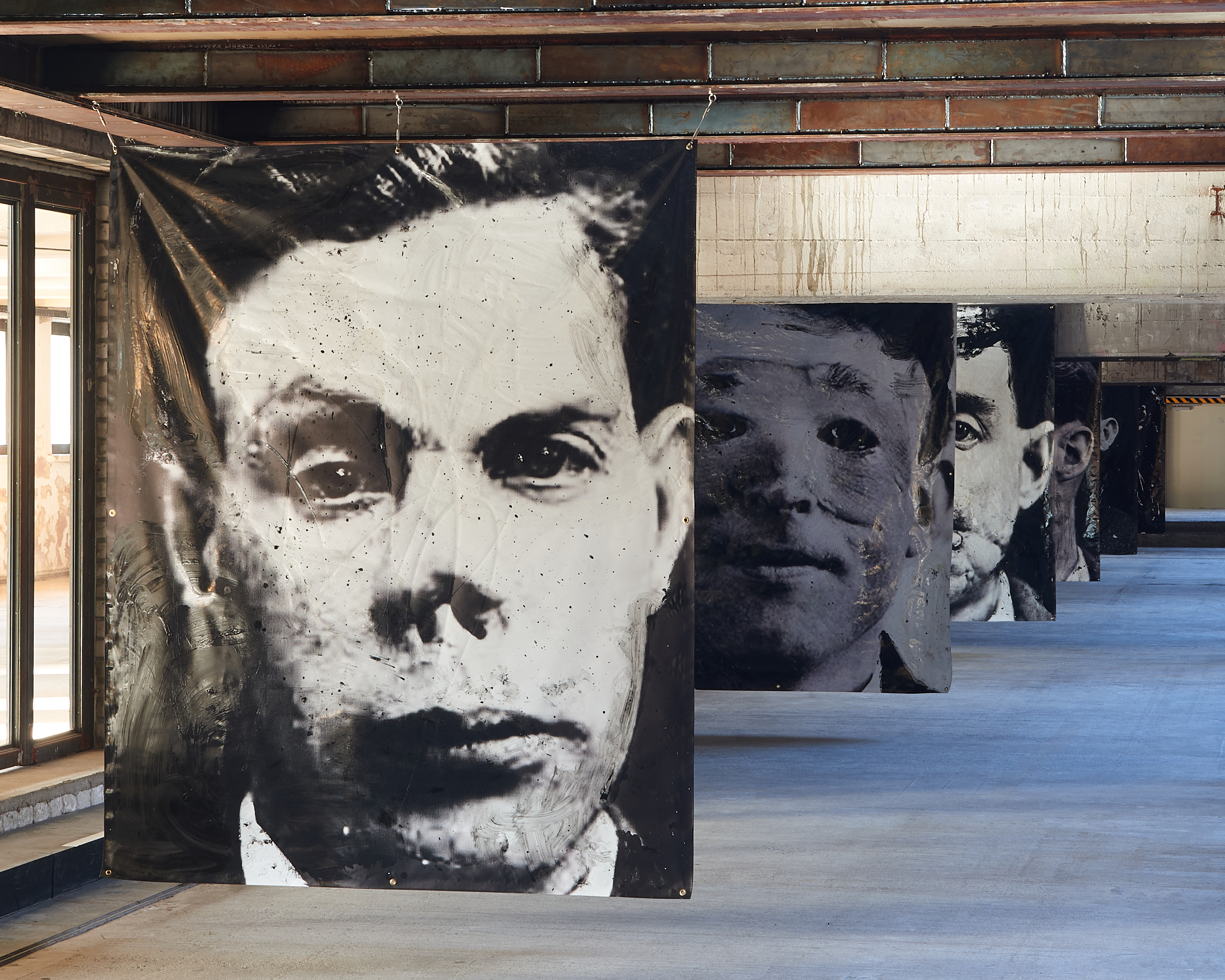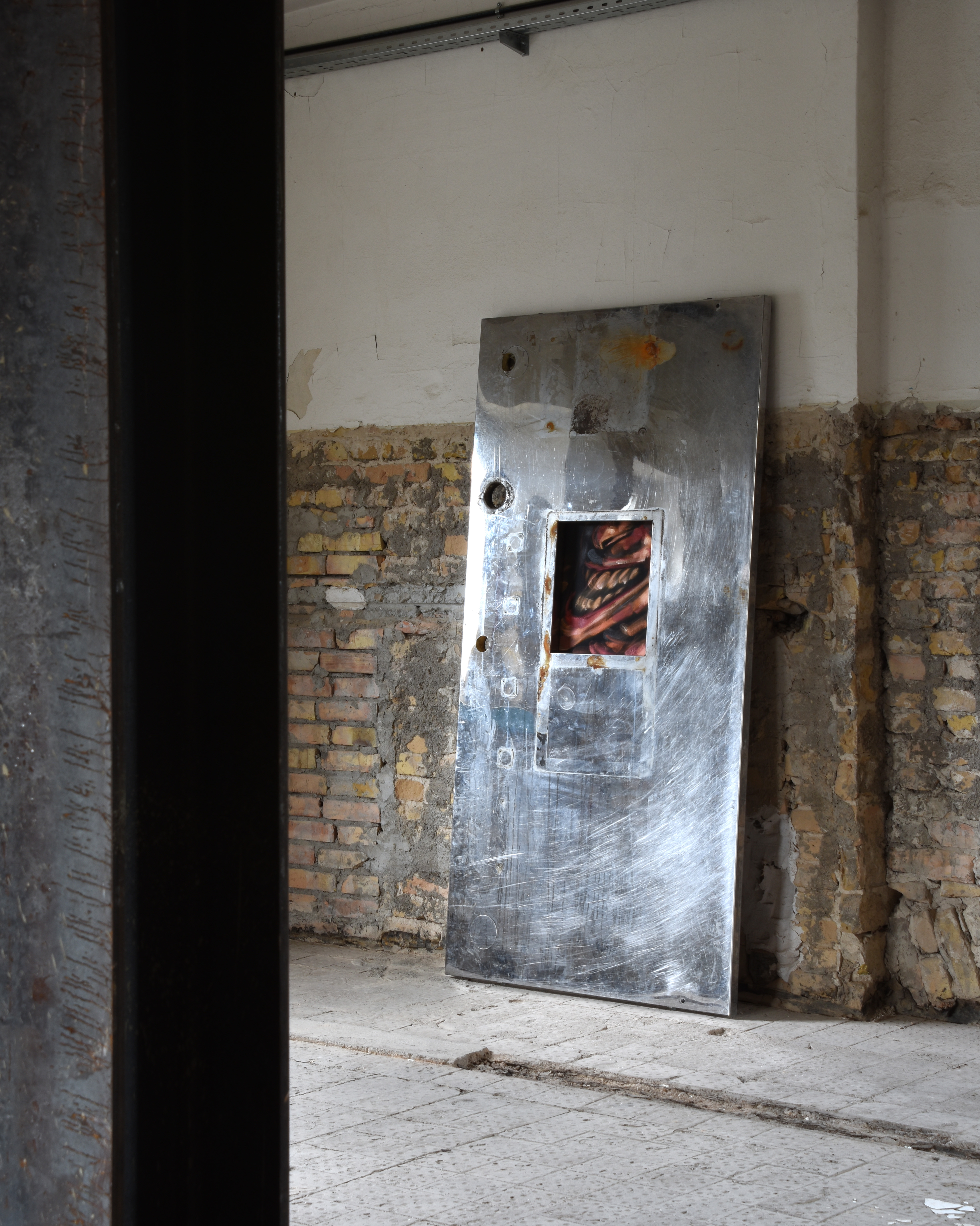 Physically integrated within the walls of the Funkhaus, Berlin, Maskenfreiheit is a site-specific installation exploring the emotional disguises we wear in our daily lives to conform to societal expectations. Laughter is often a persona we present to the exterior world in order to fit in, masking our true feelings. Specifically made to fit within the buildings stark interior, the figures rendered in the diptych become part of the structure that contains them, exploring how urban structures and societal conformities frame and fragment our true self: our real emotions.