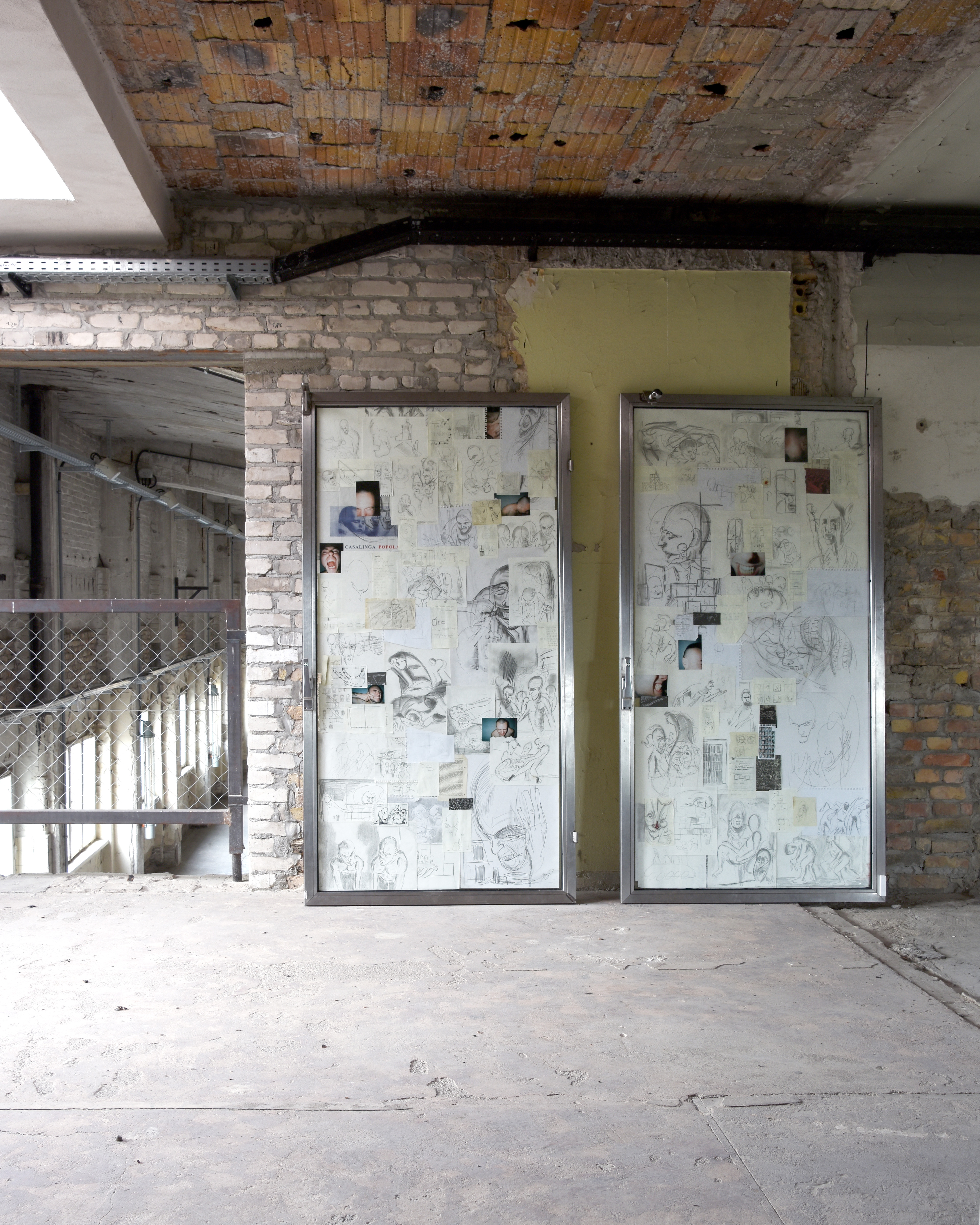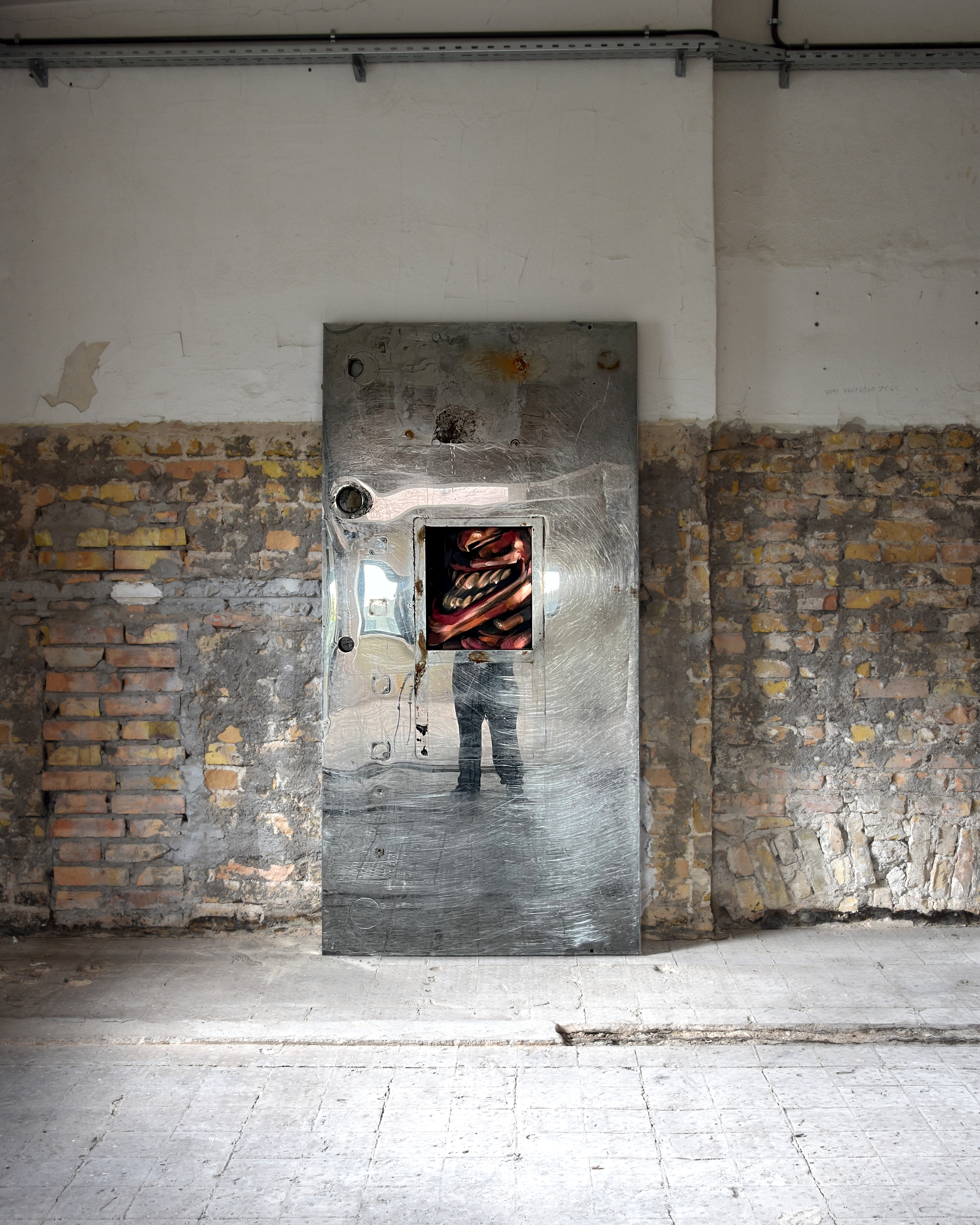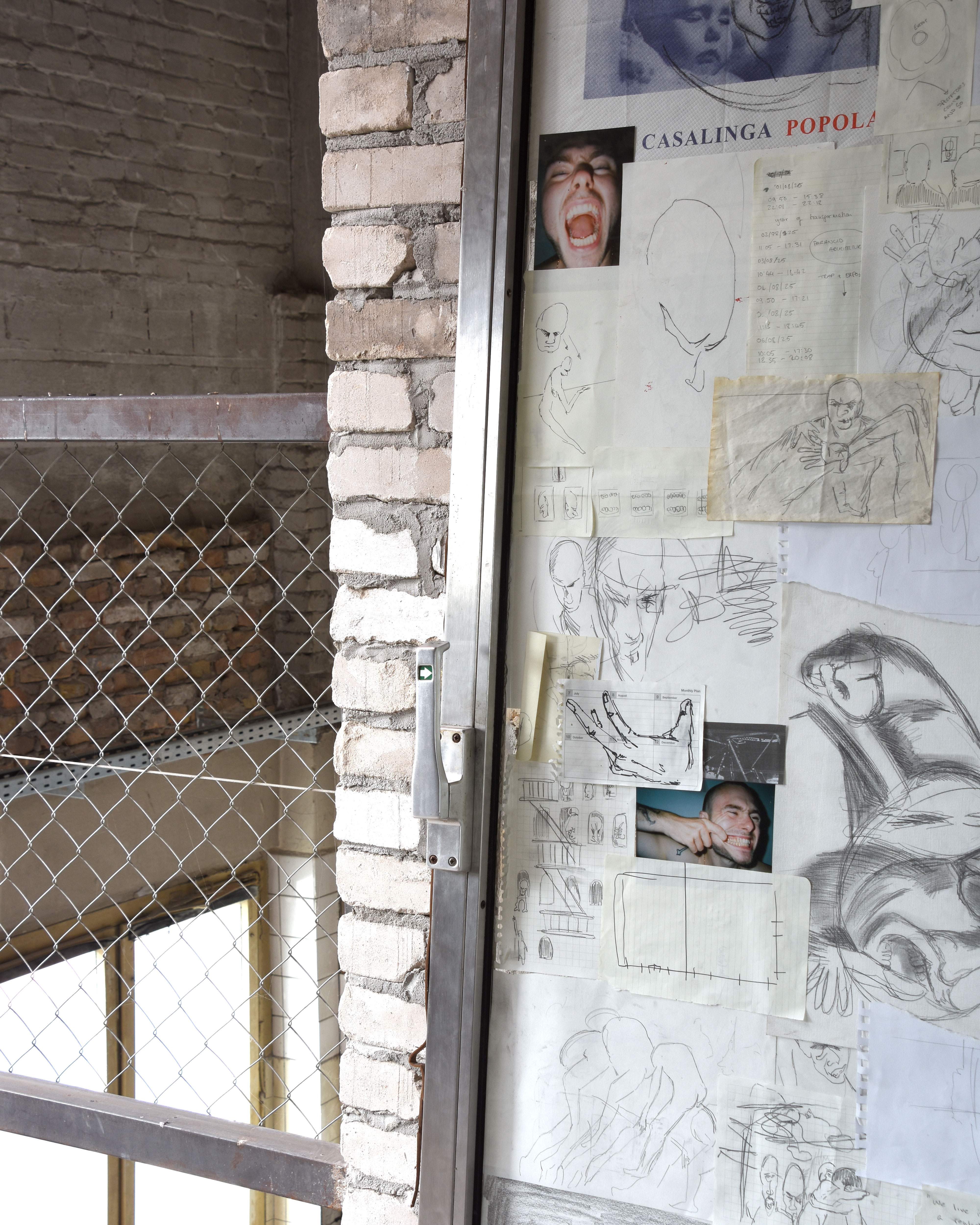 This work presents a collection of drawings, notes, timesheets, and reference photography from Marcus Nelson’s studio archive from 2021–25. Sealed beneath the reinforced glass of two security doors – found on the streets of Berlin – Contained (I,II), documents the process of making, by preserving the ephemera generated from a restless mind. Moments of violence, vulnerability, physical performance and emotional release appear and disappear under the visual noise of its entirety, all while trapped within the negative space of the object’s facade. In this work, Nelson asks how certain urban structures might support or inhibit our sense of self and what we choose to present to the external world.