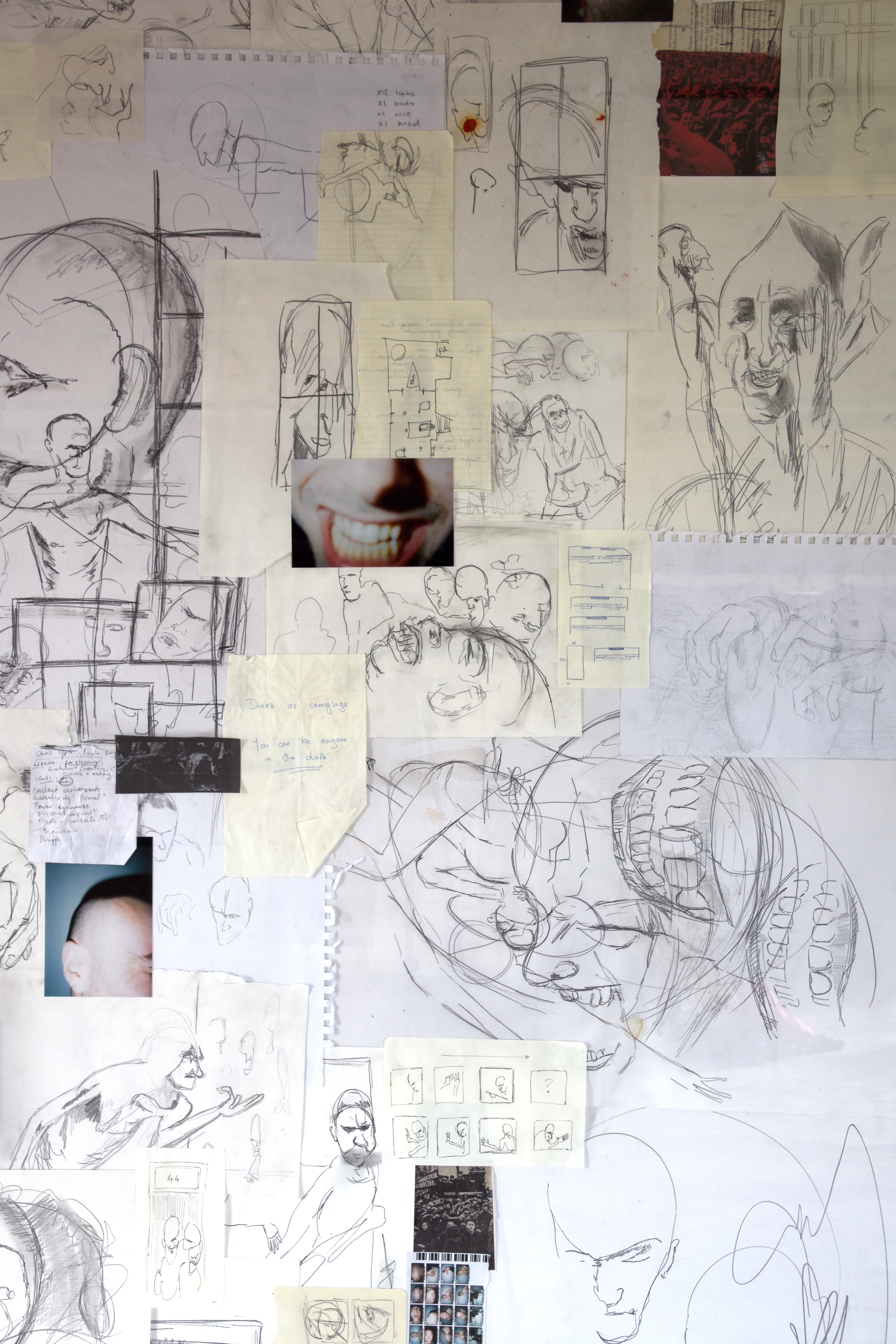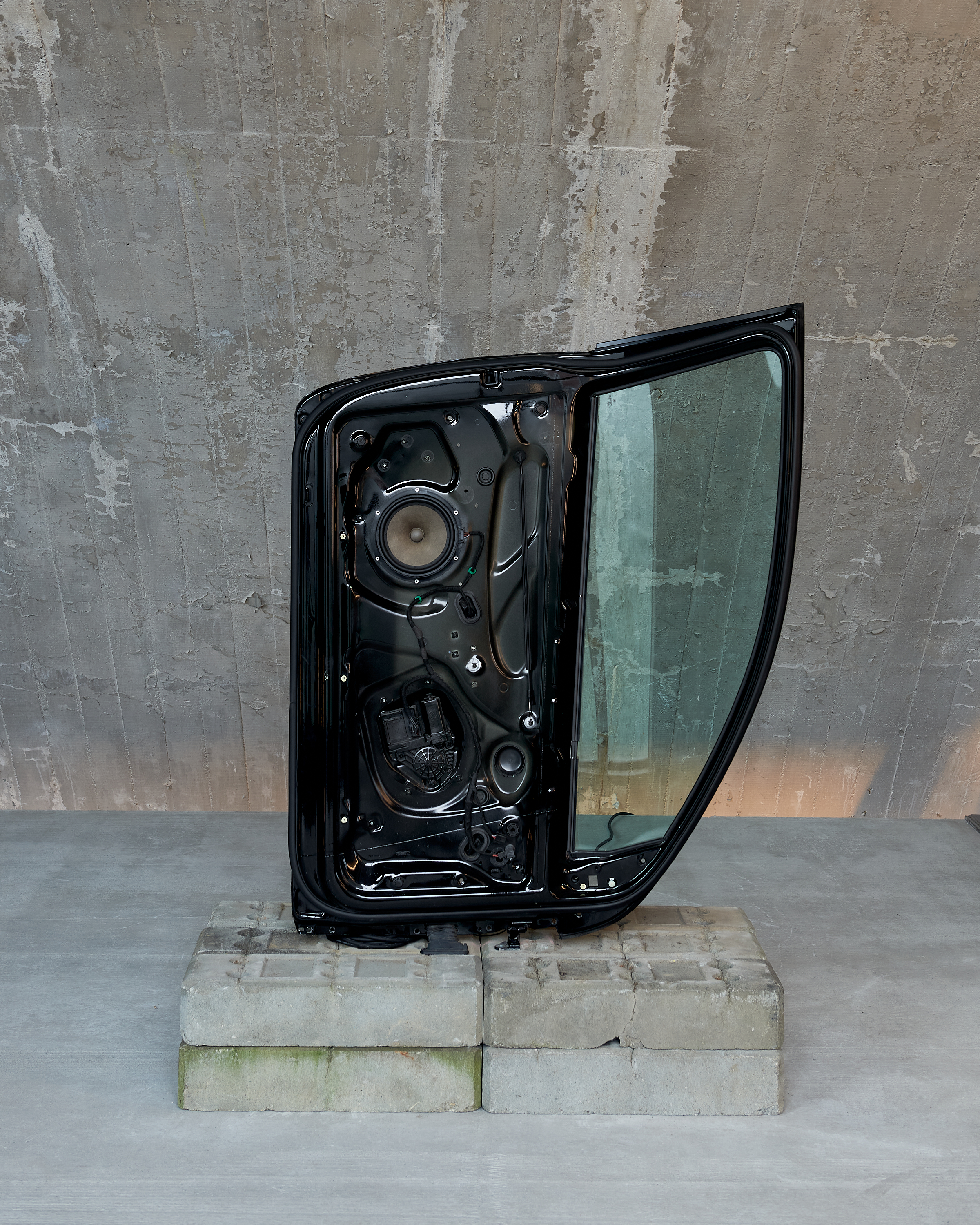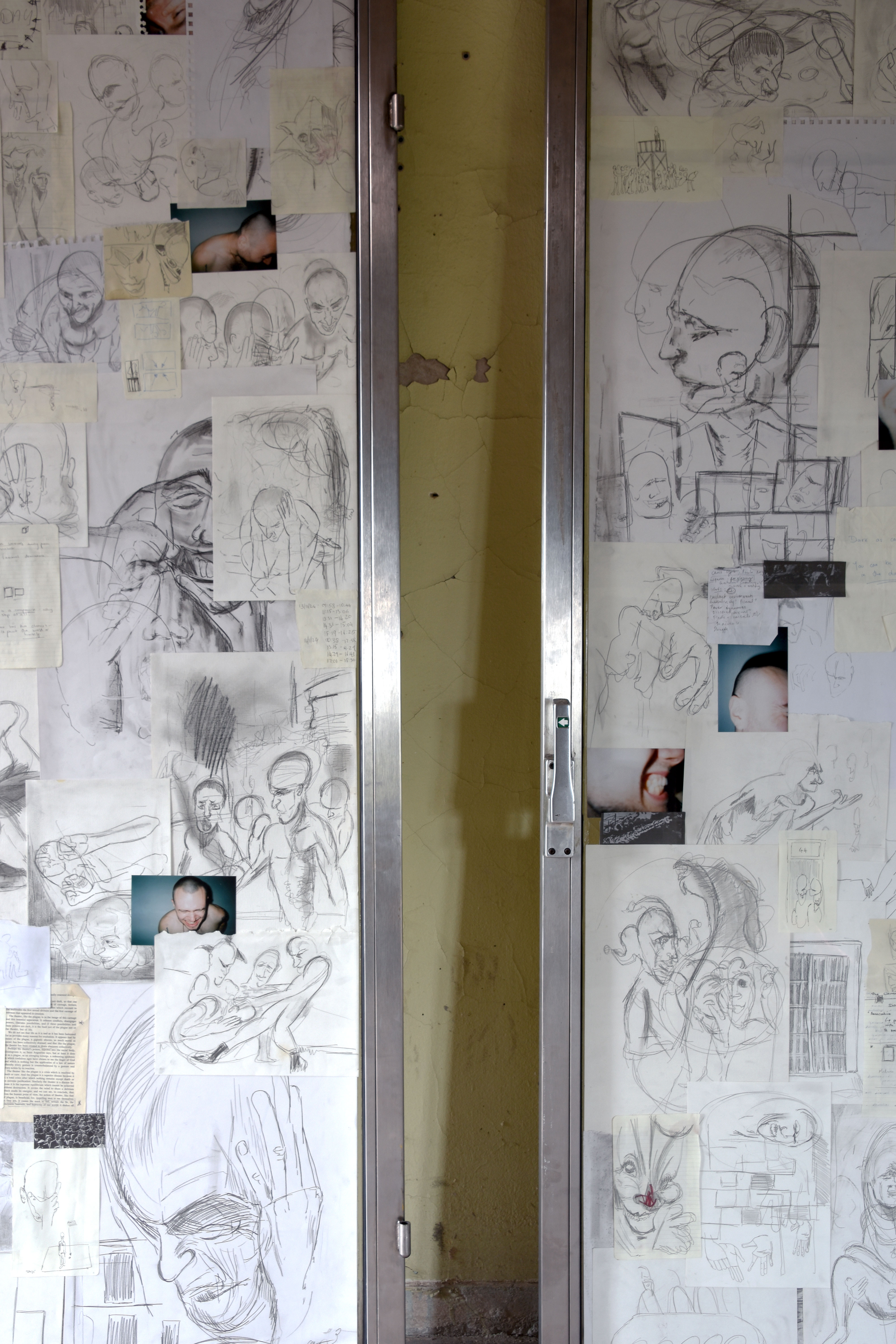 This work presents a collection of drawings, notes, timesheets, and reference photography from Marcus Nelson’s studio archive from 2021–25. Sealed beneath the reinforced glass of two security doors – found on the streets of Berlin – Contained (I,II), documents the process of making, by preserving the ephemera generated from a restless mind. Moments of violence, vulnerability, physical performance and emotional release appear and disappear under the visual noise of its entirety, all while trapped within the negative space of the object’s facade. In this work, Nelson asks how certain urban structures might support or inhibit our sense of self and what we choose to present to the external world.